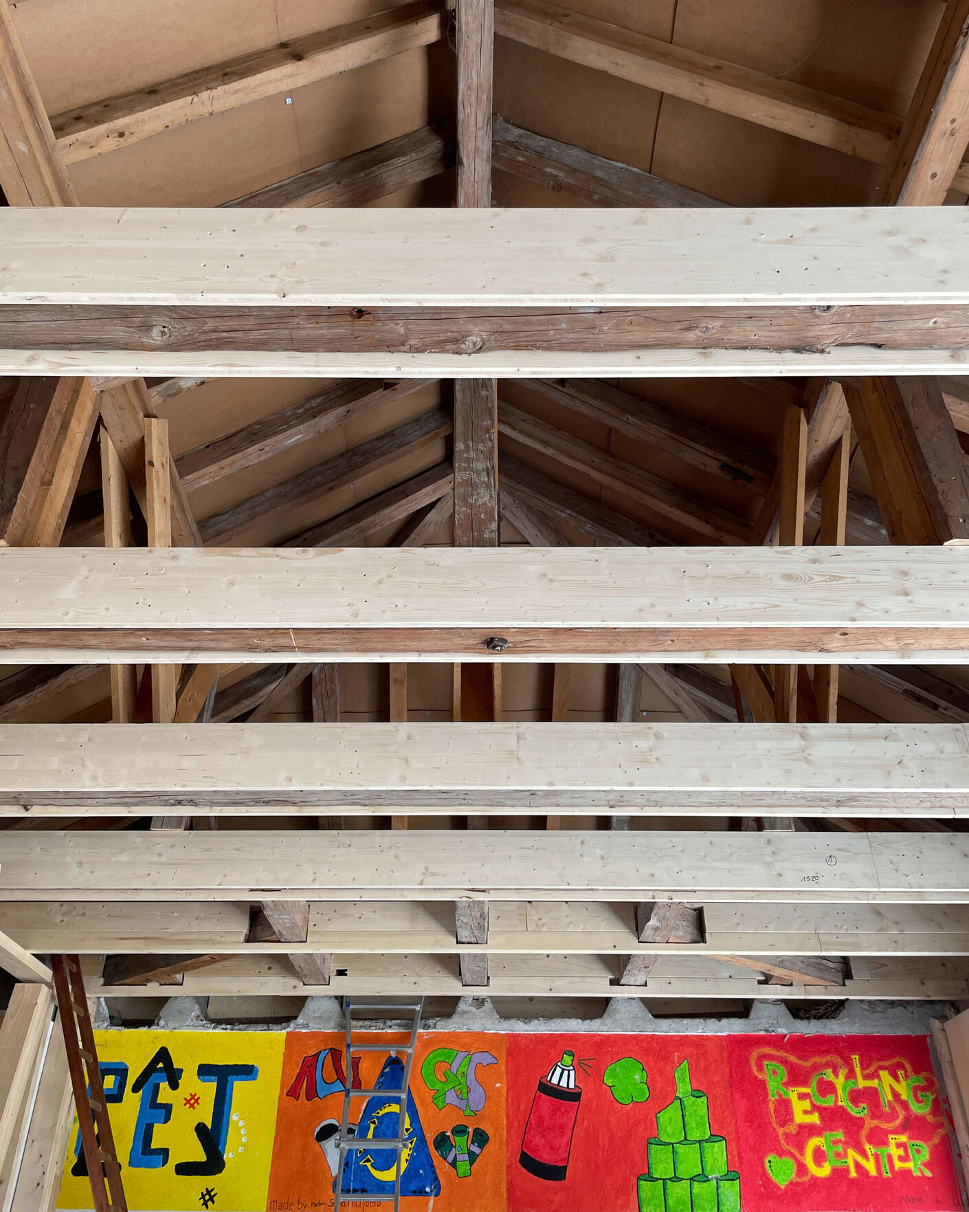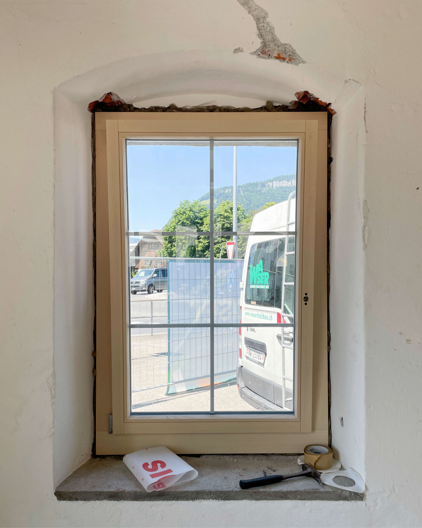 Aktuell: Die Innenwände in Holzbauweise stehen, die Rohinstallationen sind eingebaut und der Unterlagsboden befindet sich in der Trocknungsphase. Auch aussen hat sich einiges getan: Die Wand wurde ergänzt und die neuen Fenster sind montiert. Bereits jetzt lässt sich der neue Look des geschützten Objekts erahnen.