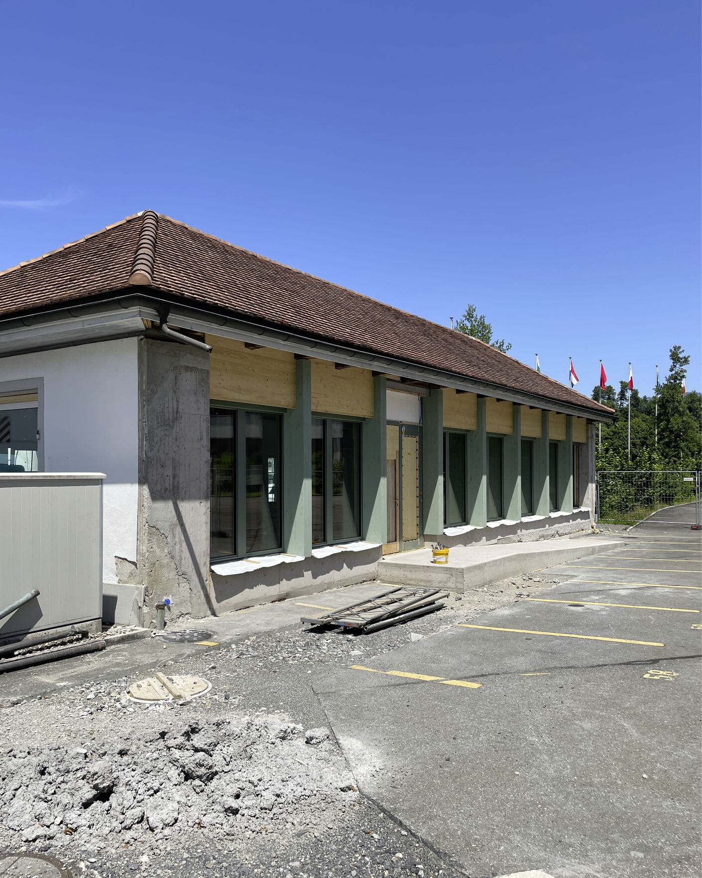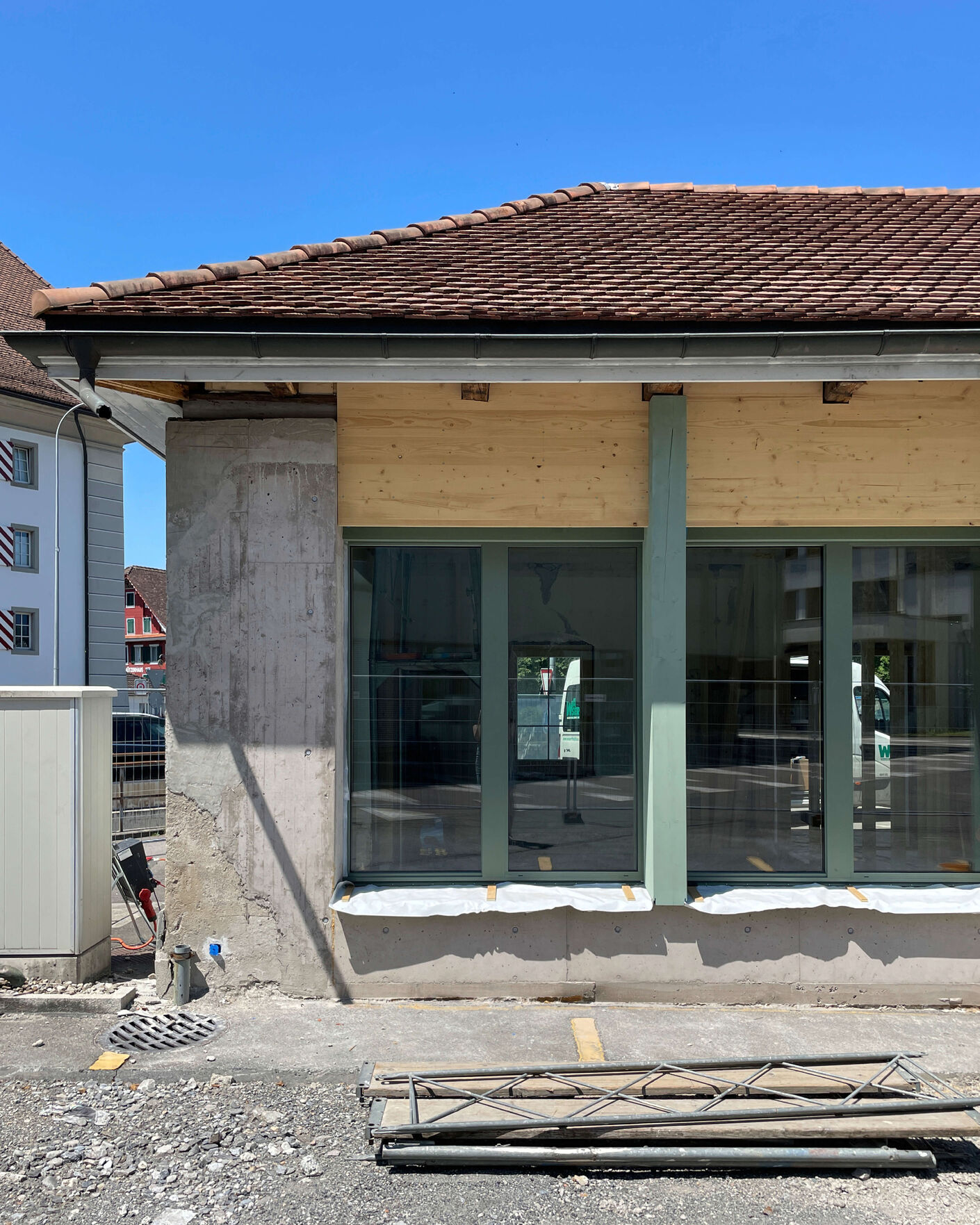 Das ehemalige Schützenhaus in Oberdorf NW erstrahlt nach einer behutsamen Sanierung bald in neuem Glanz. Die architektonischen Eingriffe orientieren sich dabei an historischen Vorbildern und bewahren den Charme des Gebäudes. Ein zeitgenössischer Innenausbau verwandelt das ehemalige Schützenhaus in neue Büroräumlichkeiten.